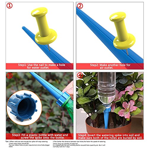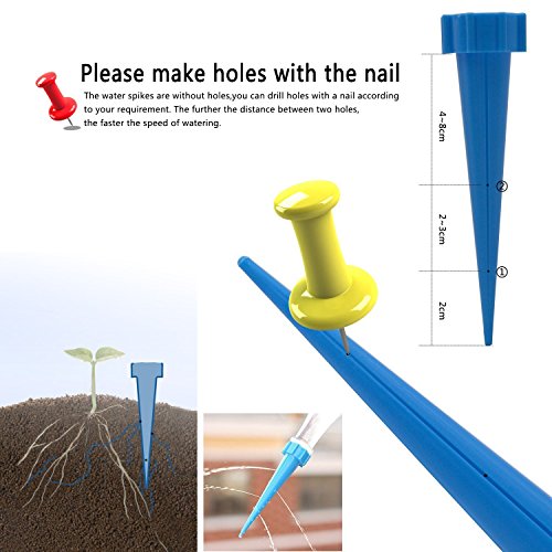 Note: The water spikes are without holes,you can drill holes with a nail according to your requirement. The further the distance between two holes,the faster the speed of watering.