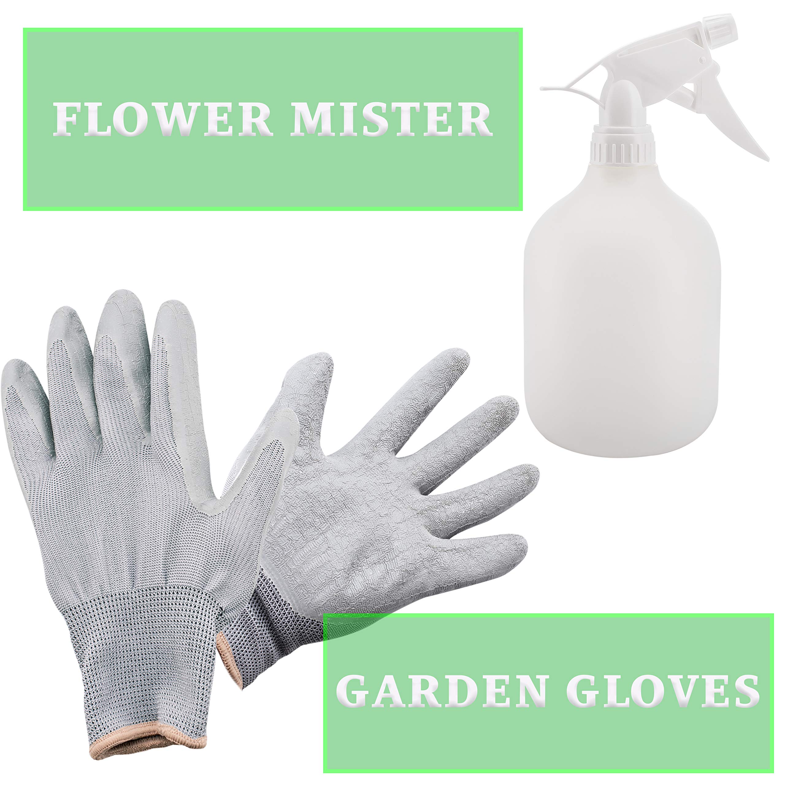 Gloves & water sprayer: comfortable, universal fit Cotton gardening gloves protect your hands from scrapes and cuts while you work. The Manual pump watering spray bottle is designed to make watering easier chemical dye and convenient.
