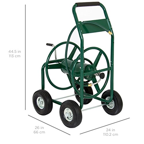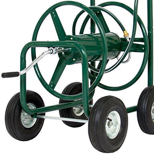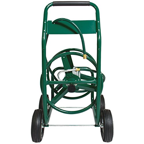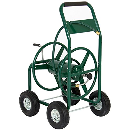 Combining functionality and quality design, this heavy-duty hose reel can hold up to 300 feet of 5/8 in. water hose. Get the job done faster and easier with a comfortable foam-padded handle and a convenient basket to store tools within arm’s reach. It’s built to last for years, designed with solid steel axles and a strong powder-coated steel frame. Large 10.5 in. wheels let you tread smoothly over uneven ground, so you can easily navigate your garden