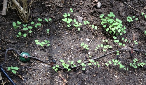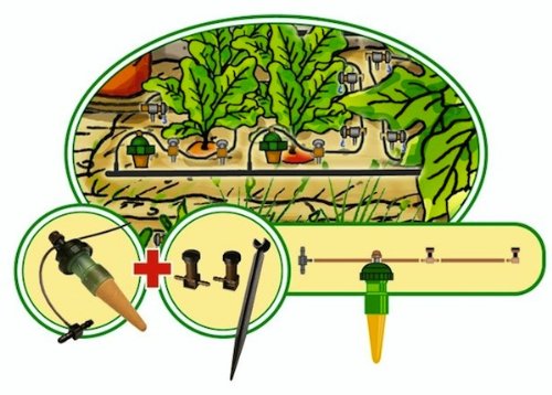 Each Tropf Blumat can control 5 of these distribution drippers and saturate a 40″ length – either in a row or around a large plant. So with this set you