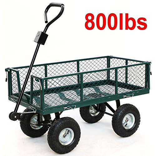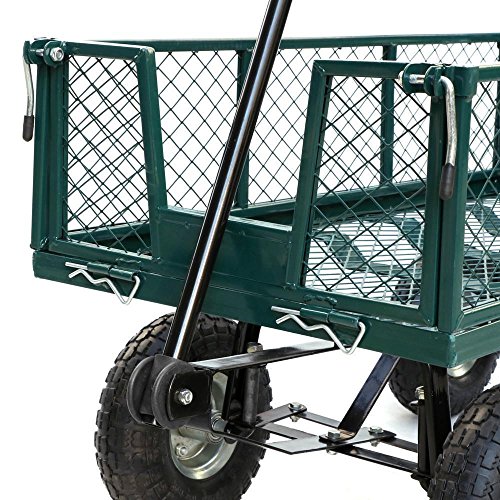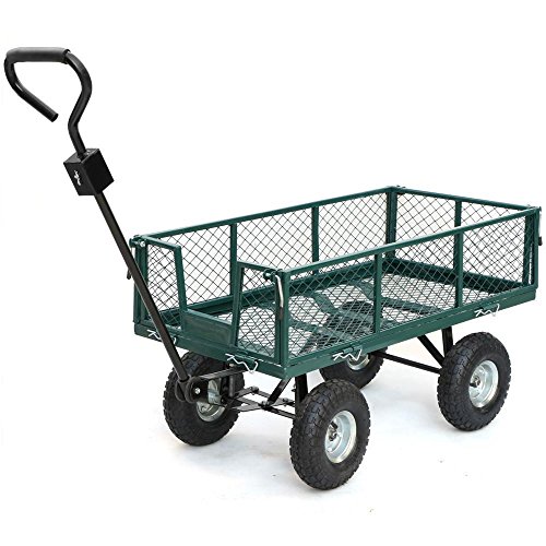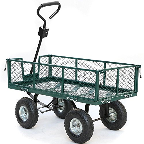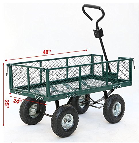 This utility cart is used for securely storing, organizing, and transporting equipment, supplies, and materials. It’s suitable for use in industrial, manufacturing, and maintenance applications, as well as in the home gardens, warehouses. The wagon can transport up to 800 lb. of supplies, equipment, or materials. Steel mesh bed with powder-coated finish for durability and corrosion resistance The sides of the crate fold down, and can be removed entirely for flatbed wagon applications, thus can facilitate loading and unloading of heavy items from the wagon, such as transporting oversized articles. The wagon comes with a 32inch steel handle with a D-style grip The padded handle makes hauling heavy dirt, mulch, gravel or plants easy with minimal fatigue. Four 10 inchx3 inch pneumatic rubber tires to resist abrasion and absorb shock while rolling on assorted indoor and outdoor terrain. The wagon is 48 x 24 x 25 inches (L x W x H). With the sides removed, the crate wagon’s height is about 14.5inch. It requires some easy assembly.