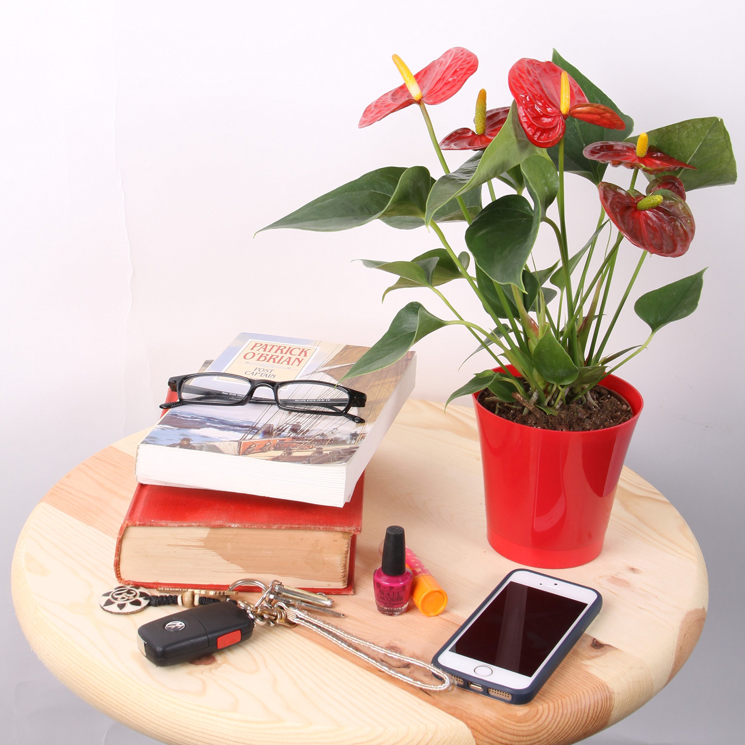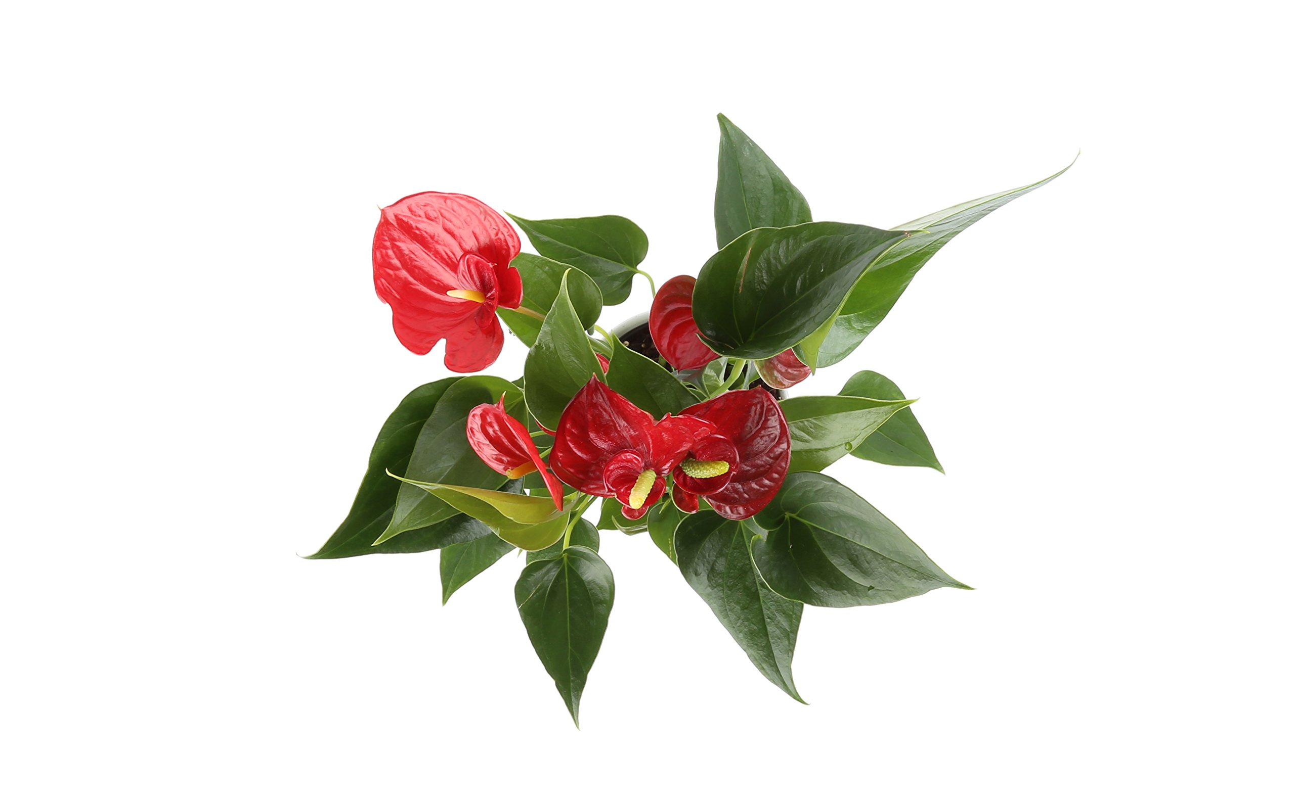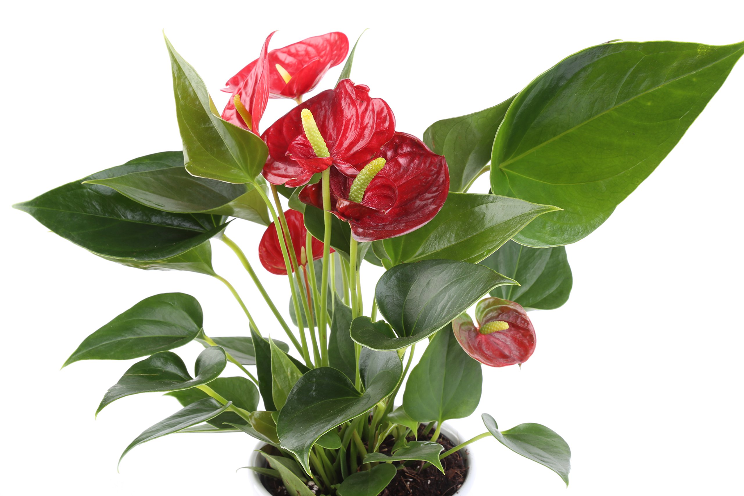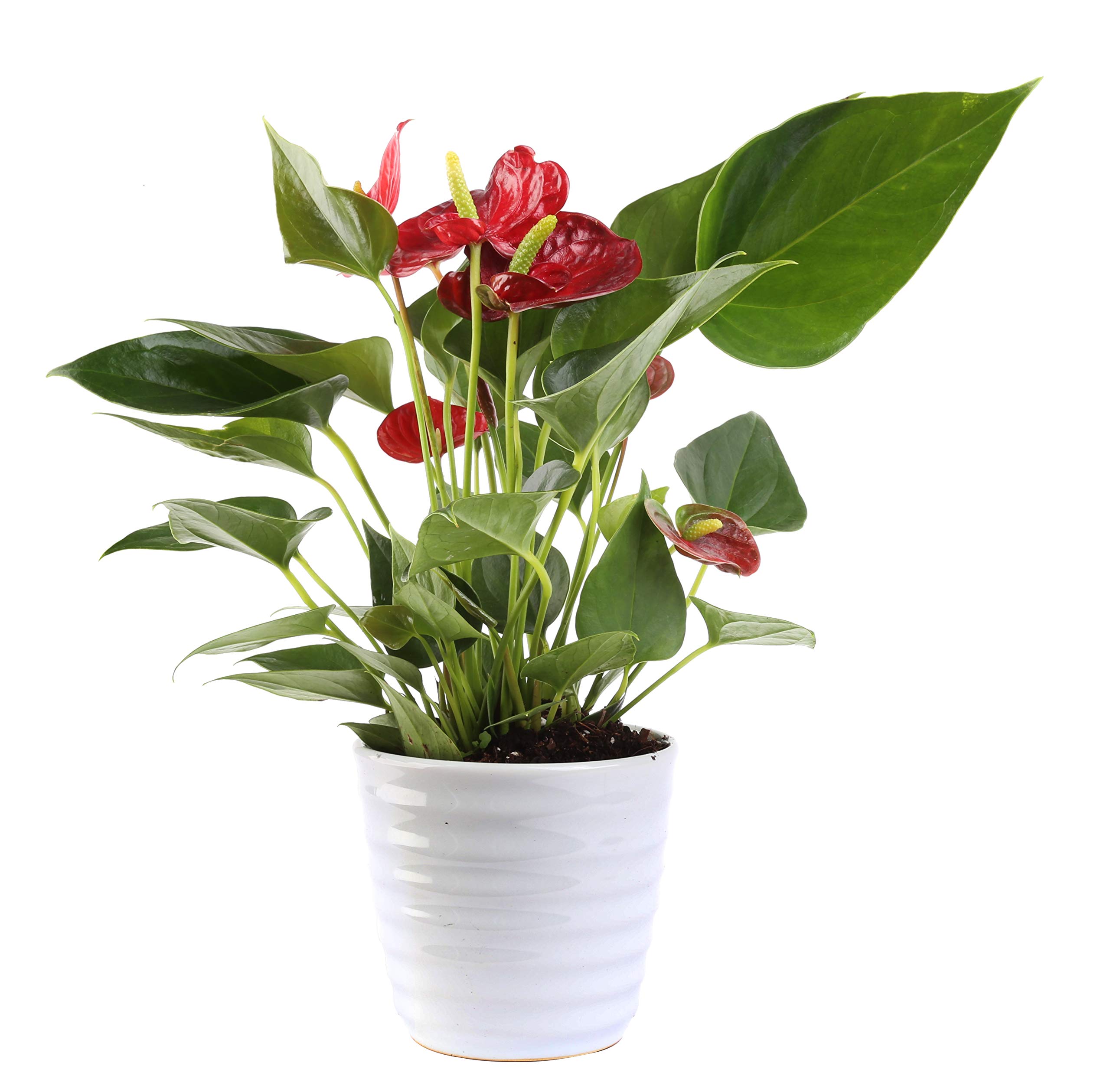 Features stunning glossy dark green heart-shaped leaves with long-lasting red blooms (flowers), comes in a white 4-inch ready home decor planter