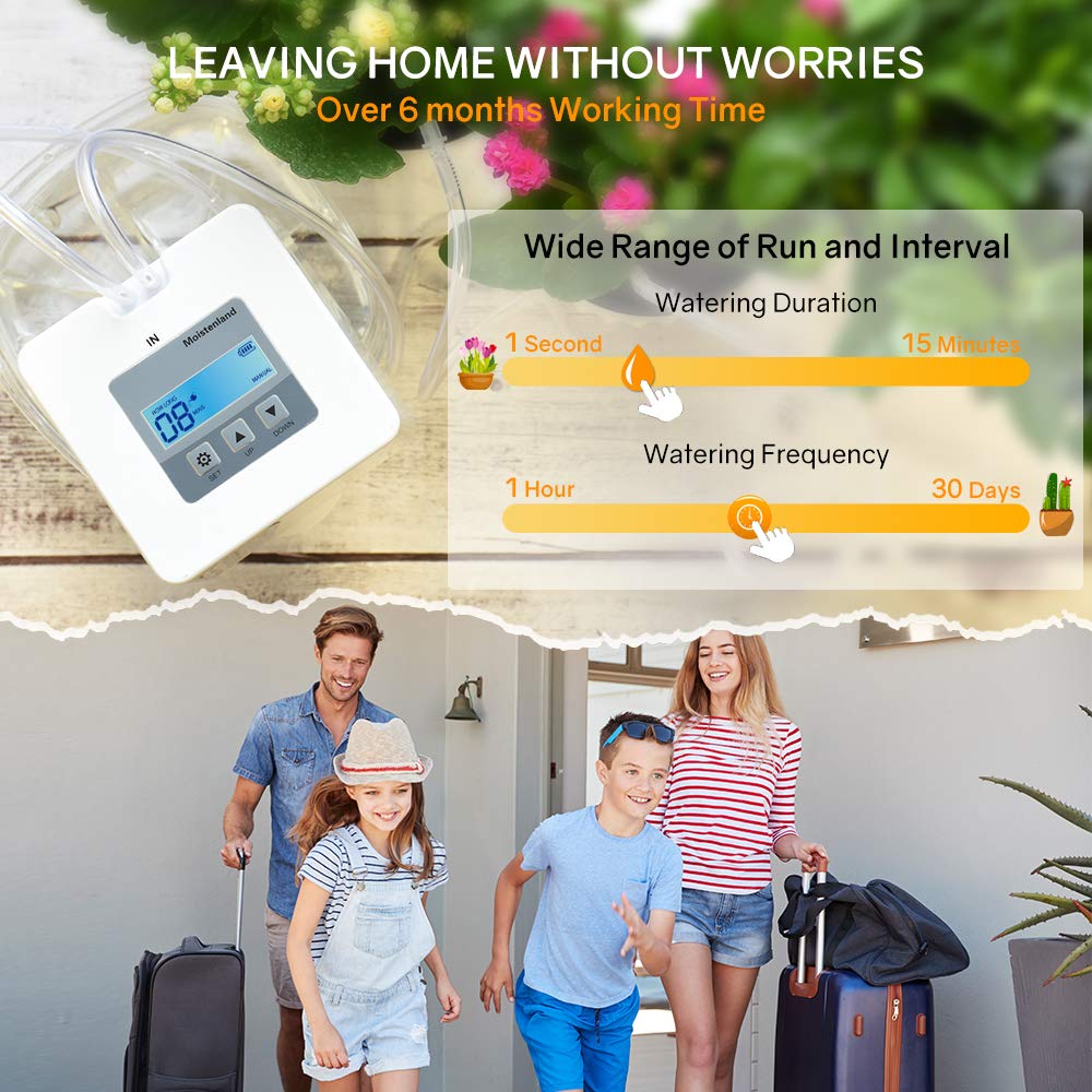 Moistenland’s Automatic Drip Watering System is the perfect solution for watering your indoor plants when you’re away for the holidays, on vacation, or just short on time. Auto or Manual Watering and Fertilizing 1. Set the Watering and Interval time to your plants need. The system will automatically water to your set schedule. 2. Water immediately with a single button press on the controller panel without influencing the set watering schedule. Low Power and Lack Water Detection & Protection 1. The alarm light on the control panel will turn red letting you know batteries need to be replaced. 2. When the water level is low, the system will shut down to protect the pump and beep intermittently. Silence the alarm by pressing any button. Battery and USB Power Power with 4 AA batteries or Micro-USB cable and power supply such as a phone charger (minimum 1 Amp requirement). Enjoying peace of mind knowing the AA batteries will act as a backup during power outages. Save Water and Money Automatic Drip irrigation system is up to 70% more efficient than other methods. Drip irrigation is directed to the root ball of the plant eliminating run-off and evaporation for healthier more vibrant plants. Simple Step To Install Included accessories of our all-in-one drip system are enough for 5 to 10 pots and can be set up in as little as 15 minutes.SPECIAL NOTE:Soaking the tubing in hot water will ease installation. Please DO NOT place the water source in a position higher than containers, to avoid causing SIPHON EFFECT.