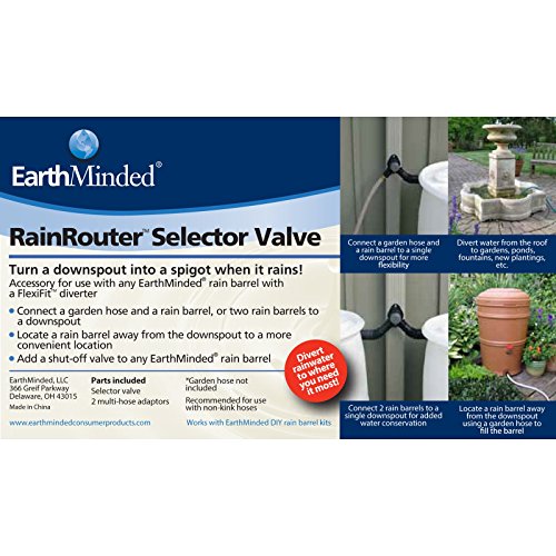 Designed for use with any Earth Minded Rain Station barrel or DIY Rain Barrel Kit that includes the FlexiFit diverter, the EarthMinded RainRouter Selector Valve transforms your downspout into a spigot. It features two outlets, which can connect a garden hose and rain barrel or two rain barrels. This valve allows you to send rainwater directly from a downspout to a garden hose. Dimensions: 4L x 4W x 4H in.. Crafted from high-density polyethylene (HPDE) resin. Accessory item for EarthMinded FlexiFit diverter. Can be used to divert roof water to gardens. Can supply roof water into 2 different rain barrels. Includes illustrated user guide.