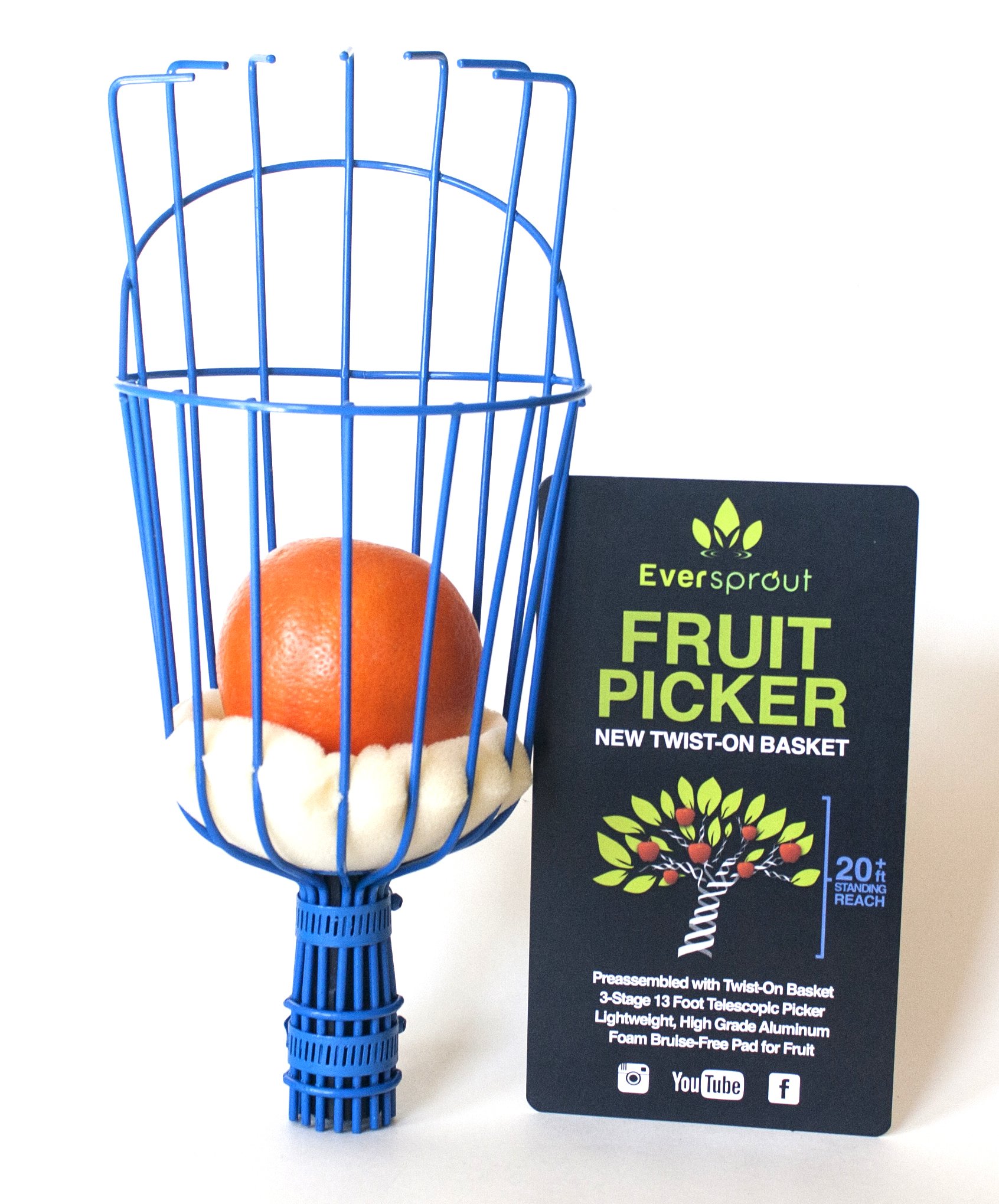 THE FIRST & ONLY TWIST-ON FRUIT PICKER BASKET (Pole sold separately). The Eversprout Fruit Picker basket actually twists onto a threaded pole (3/4” ACME Thread Pole Tip) providing a secure attachment, unlike other non-twist fruit pickers which are often unreliable and may come loose.