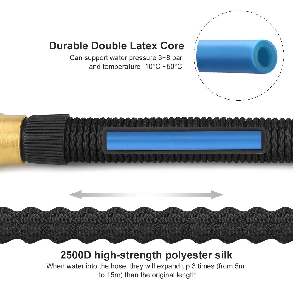 DUCTILITY & PRESSURE RESISTANCE: Not tangle, not twist, not kink. Garden water hose can extend from 15ft to 50ft, and can withstand water pressures from 3 to 8 bar and temperatures from 40℉(-10°C) to 122°F (50°C).
