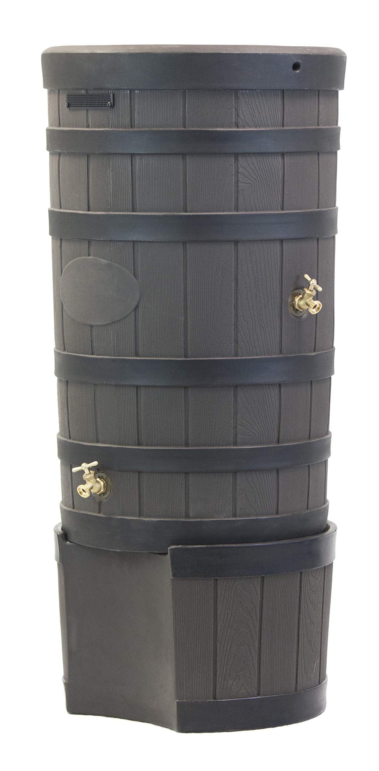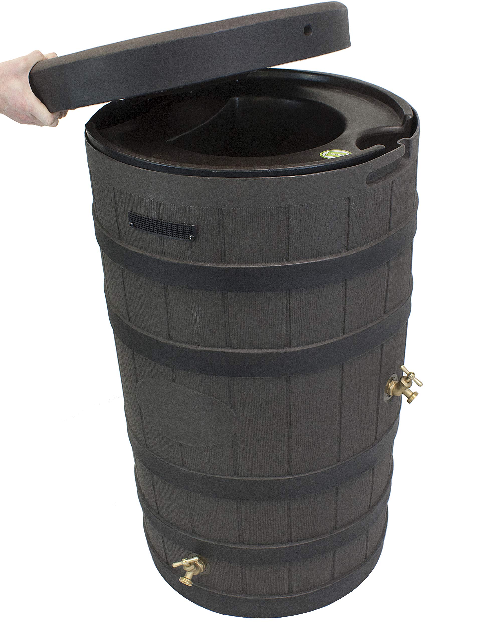 The American Oak is a 50 gallon rain saver that comes packed with features. Immediately, you can tell that this is a high quality barrel. The deep wood grain texture and the darkened ribs pop out and capture the eye. The authentic whiskey barrel look is completed with two brass spigots. These spigots are located at locations to optimize flow: One at the bottom to get the most out of the barrel and one on the size to utilize buckets and linking. The spigots are 3/4″ and will work with all standard female hoses. The top of the barrel holds a locking, removable top. By twisting, you can keep the barrel sealed to protect young ones and keep out mosquitoes. Just twist it the other way and it lifts off. At the center of the lid is a mesh screen that will accommodate all standard downspouts and keep out bugs and leaves. The tapered nature of the lid minimizes splashing and funnels all the water towards the anti-debris screen. Start collecting fresh, chemical-free water for your lawn and garden with the Rain Wizard American Oak.