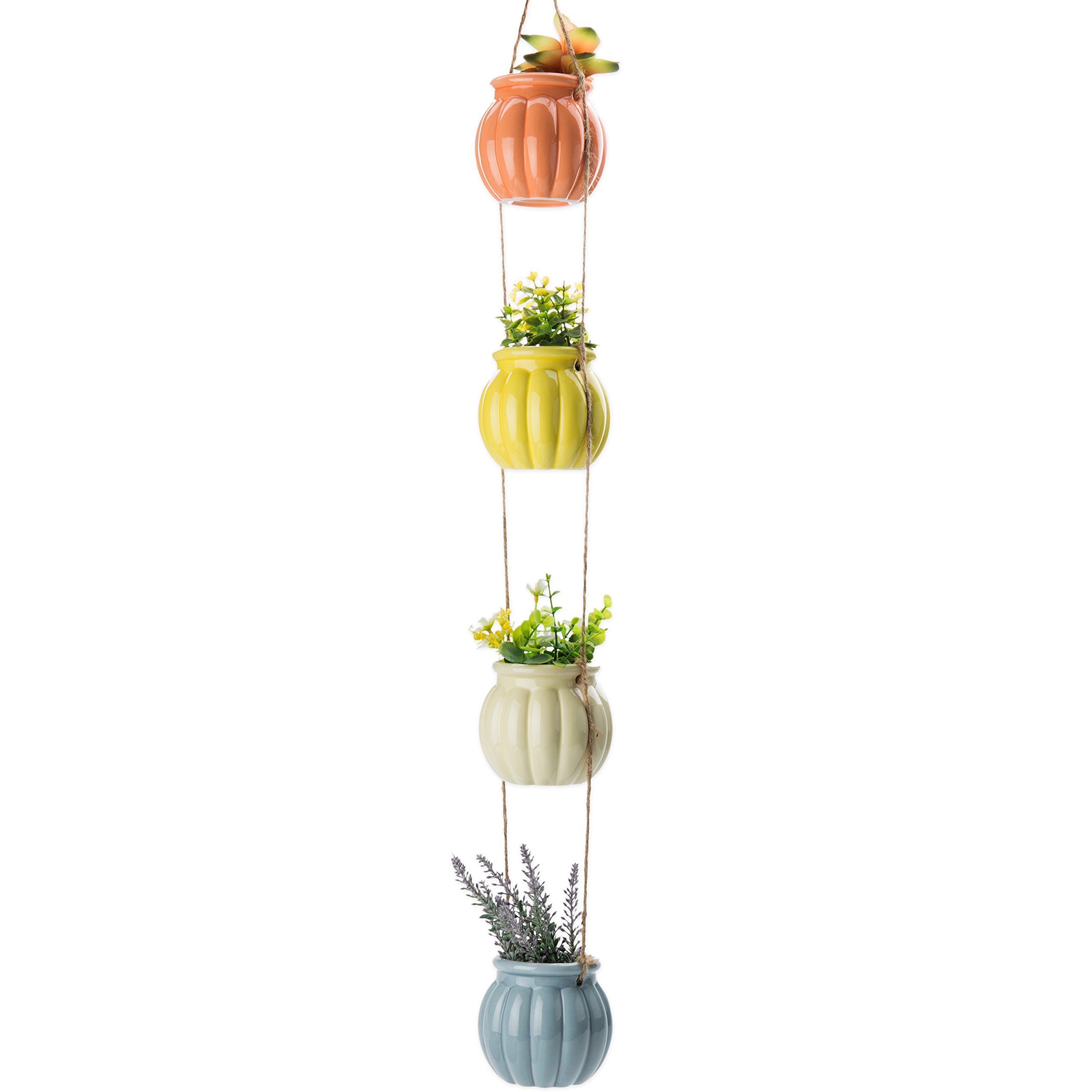 MULTICOLOR HANGING POTS: Hanging ceramic planters in mixed pastel colors with jute rope that connects the 4 pots.