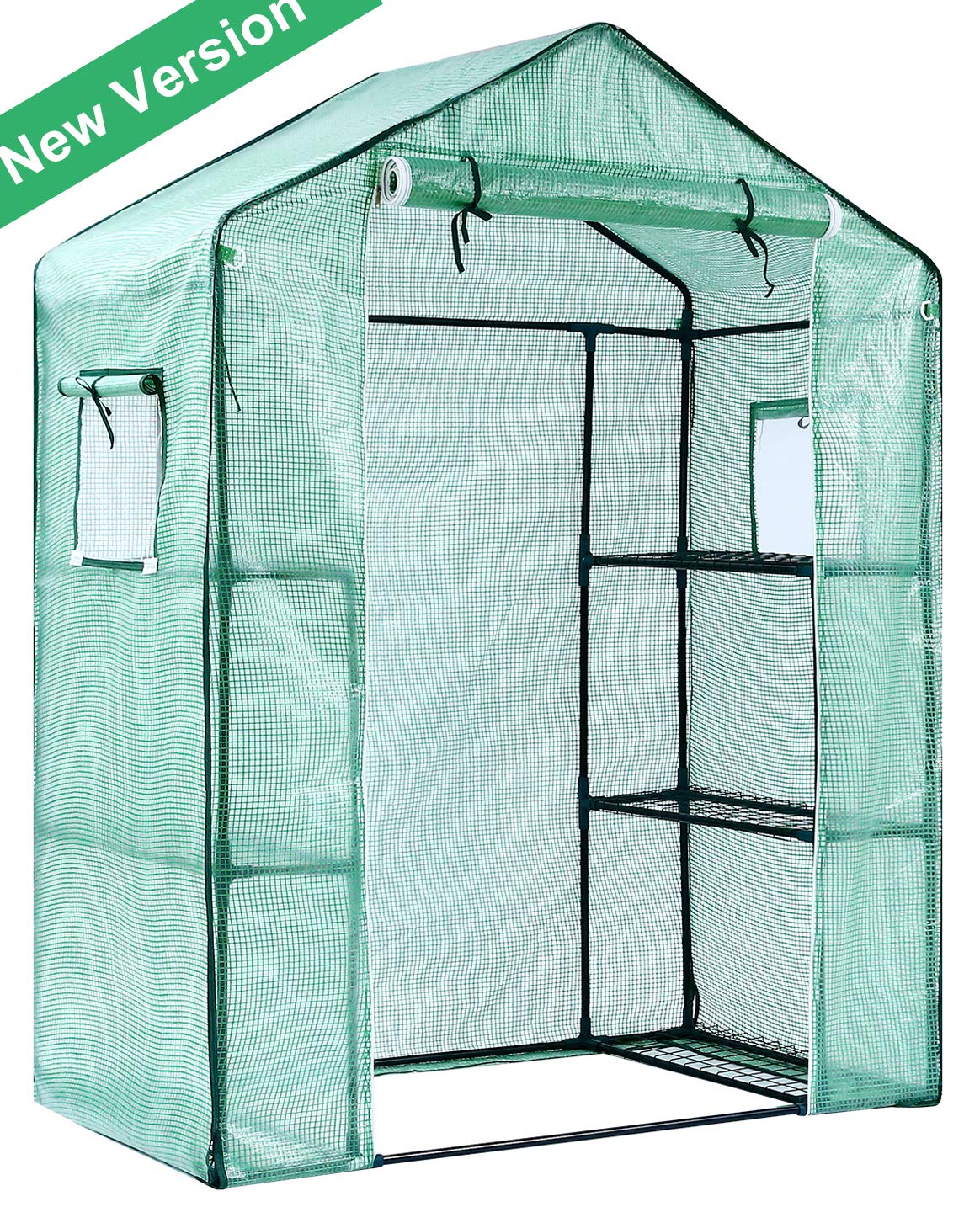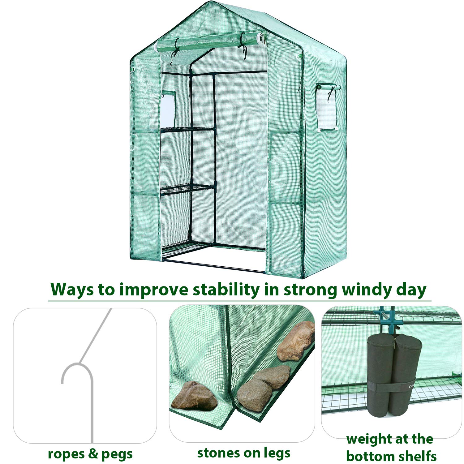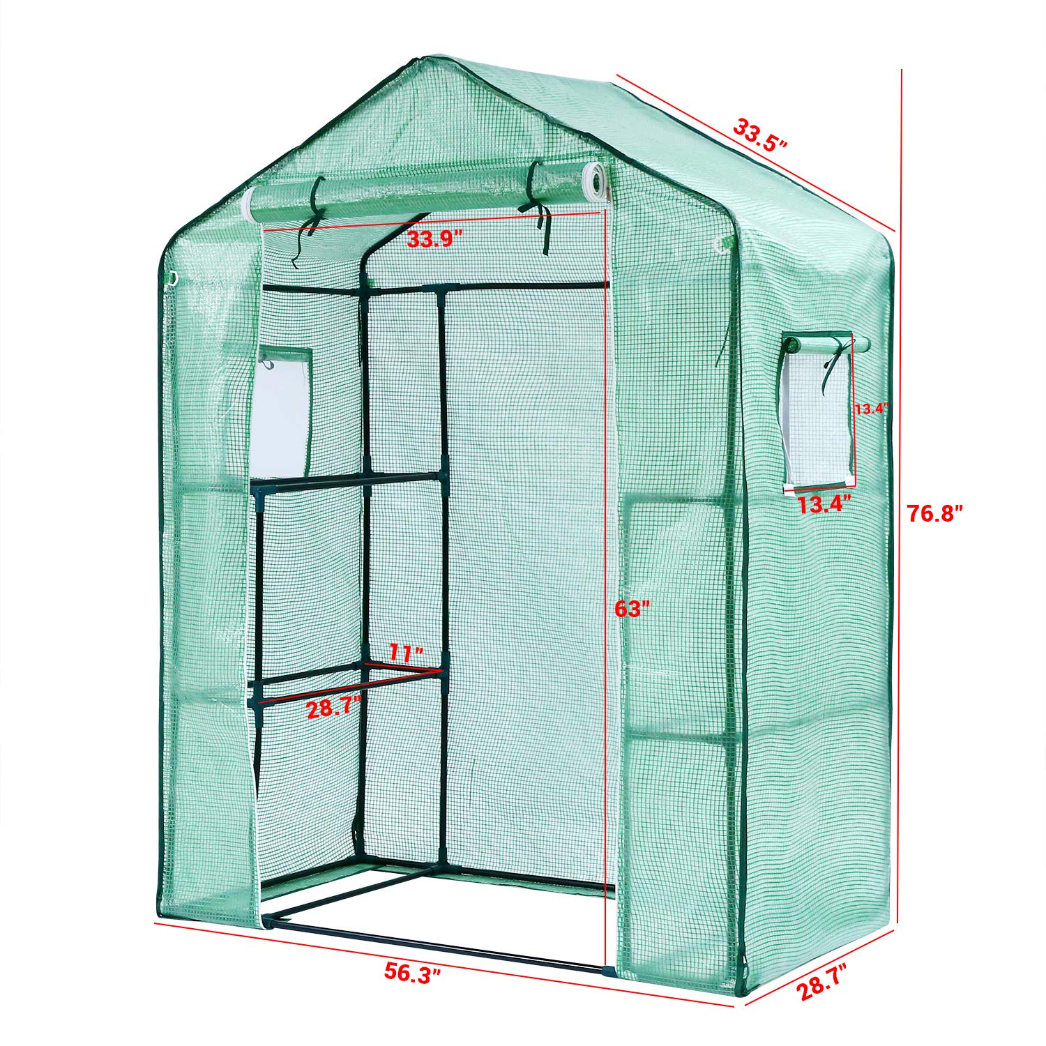 This green house is also designed with zippered roll-up door and 2 Velcro side windows for easy access and screened ventilation for optimum air circulation. Ideal for starting seedlings, protecting young plants, and for extending the plant growing season.