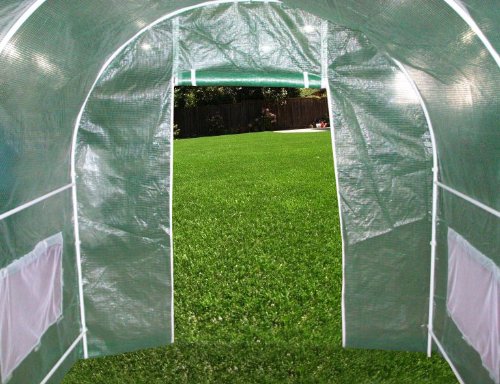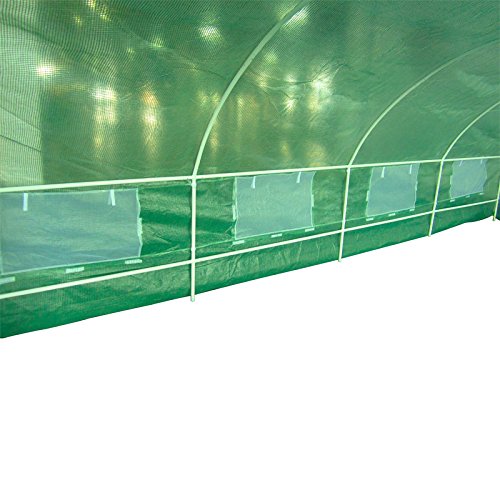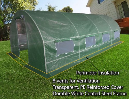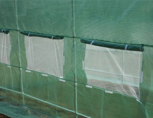 Why not give your vegetables, flowers and other plants a perfect shelter in the chilly winters? Our large polytunnel greenhouse is created to provide proper temperature, humidity, sunlight to your nursery plants. Large but lightweight! UV protected and transparent, waterproof, green PE reinforced cover allows for sufficient solar performance. Strong white powder coated steel poles can be assembled in minutes without tools. Eight vents and a zippered front door are good for ventilation. Fully closed cover keeps your plants from birds, pest, extremes heat and humidity. Perimeter insulation prevents frost from penetrating under the wall of greenhouse. Thus ensures optimal conditions to your plants.