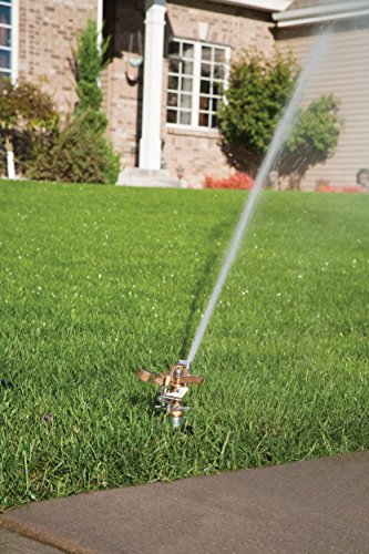 Rain Bird 25PJLSP Hose-End Brass Impact Sprinkler on Large Spike, Adjustable 20° to 360° Pattern, 20 to 41′ Spray Distance. The #1 selling brass impact sprinkler; delivering reliable performance season