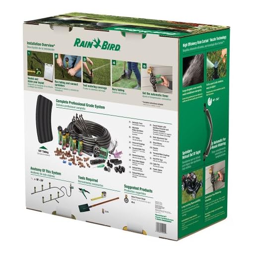 Rain Bird 32ETI Easy to Install In-Ground Automatic Sprinkler System Kit. This all-in-one kit includes everything needed to install a complete underground sprinkler system capable of watering an area from 1000 to 3,000 square feet; conveniently sourcing water from any outdoor hose faucet. An easy-to-install, affordable and effective automatic sprinkler system for homeowners. This system offers do-it-yourselfers a more efficient, automatic way to achieve a beautiful, green lawn without having to drag out a hose or remember to move a sprinkler around. Now you can spend the weekend enjoying your yard instead of worrying about watering it. Kit provides all the supplies necessary for a simple five-step installation. Kit consists of: 125 feet of 1/2″ distribution tubing, fittings, six professional grade high-efficiency 32SA pop-up rotary sprinklers and a durable, professional-grade automatic 1ZEHTMR hose-end timer. The dependable 32SA Rotors feature Rain Bird’s patented Rain Curtain™ nozzle technology which delivers a rotating curtain of large water droplets that fall exactly where you want them and resist windblown overspray. Water disperses evenly from nozzle to end of stream to reduce watering time and save money. “Micro Ramps” on nozzle direct a portion of the spray close to the head eliminating dry brown spots common with other brands. Provides a true 4″ pop-up height to clear taller grass. Simple adjustments for spray rotation and distance help keep water on your lawn and off the house, sidewalk and driveway. Water-lubricated, gear-driven design provides long-lasting dependability. A dual-action, positive-stop wiper seal protects the internals from debris while assuring positive pop-up and retraction. Adjusts easily from 40° to 360° part-circle arc, and reversing full-circle arc rotation using a flat head screwdriver. The robust 1ZEHTMR hose-end timer features a large display and simple programming allowing users to enter a desired watering schedule for any days of the week they choose up to two times a day. The sophisticated, yet simple timer is easily customizable to comply with local watering restrictions or other specific needs, such as watering sloped areas and avoiding runoff. “Water Now” and “Cancel Watering” settings provide optimal control without interrupting pre-programmed settings. “Cancel Watering” feature also operates as a “Rain Delay” allowing selection of up to a 96-hour pause in watering before stored programming resumes. Timer working temperatures: keep from freezing to 110° F maximum. Operates on two AA batteries (not included). Rain Bird “The Intelligent Use of Water”