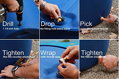 Bulkhead fitting need 1.25 inch diameter hole to install. Fit up to 0.4 inch thickness wall(Works great for 55 gallon used plastic drum barrels on craigslist, these barrels usually have wall thickness of 0.1-0.2 inch). Large 10mm Flow Opening, Great Flow Rate at Approx. 15 Second/Gallon or 4GPM, Tested with 2 ft Water.
