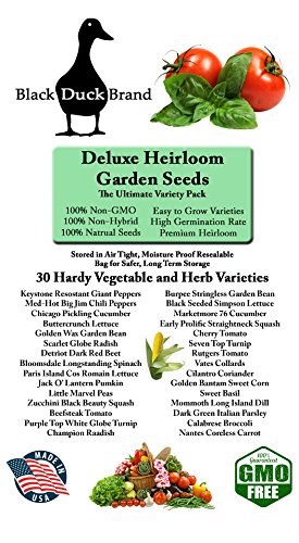 Included Varieties – Chicago Pickling Cucumber, White Spine Cucumber, Golden Bantam Sweet Corn, Stowell’s Evergreen Sweet Corn, Country Gentleman Sweet Corn, Collards, Buttercrunch Lettuce, Spinach, Coriander Cilantro, Parris Island Romaine, Zucchini Black Squash, MarketMore Cucumber, Peas, Garden Wax Bean, Green Pod Garden Bean, Detroit Beet, Cherry Tomato, Rutgers Tomato, Chili Pepper, Beefsteak Tomato, Straightneck Squash, Carrot, Basil, Dill, Parsley, Green Pepper, Champion Radish, Broccoli,