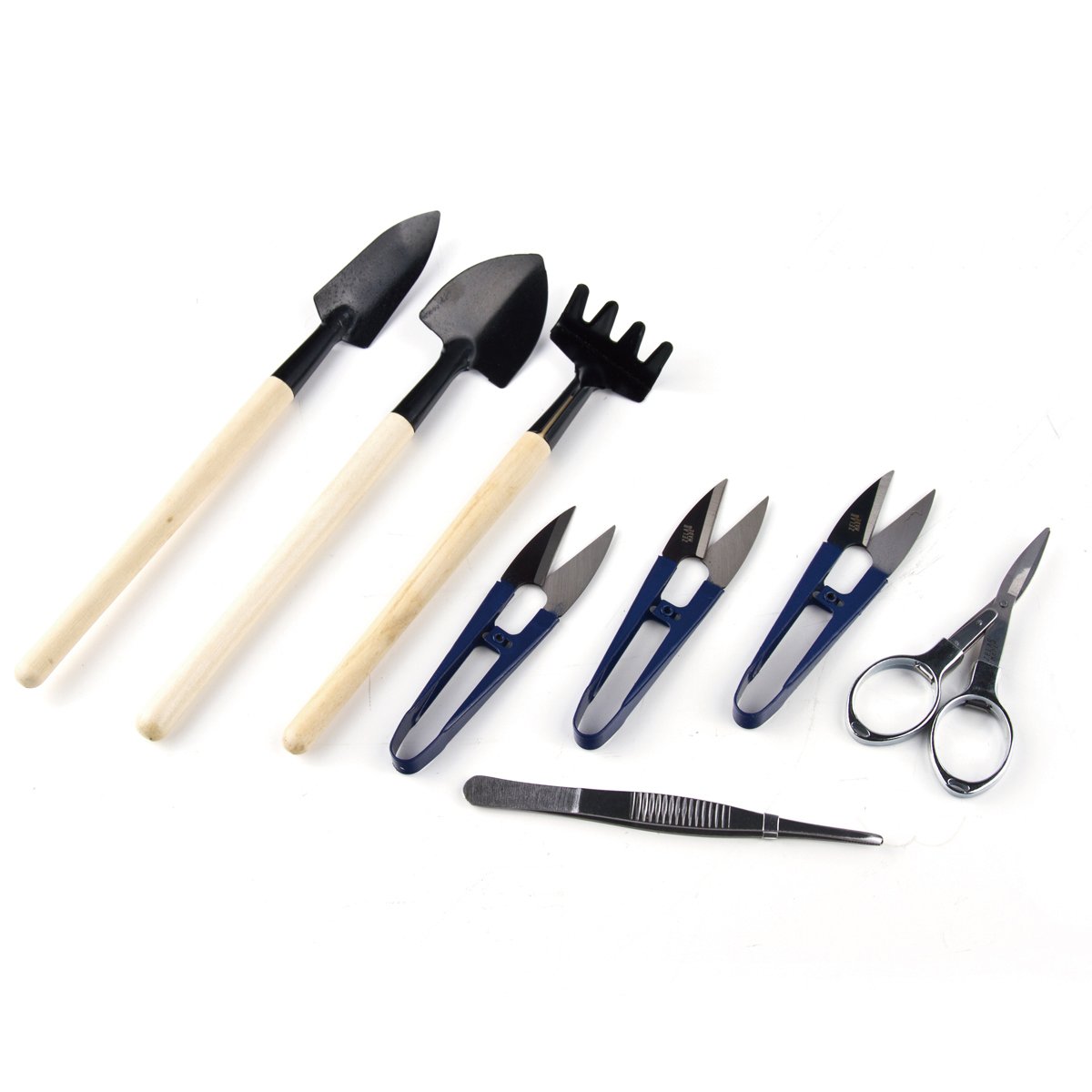 Set of 8 – Include 3 Bonsai Pruning scissors + 1Folding Scissor + 1 Wooden rake + 2 Wooden spades + 1 Stainless Steel tweezer.